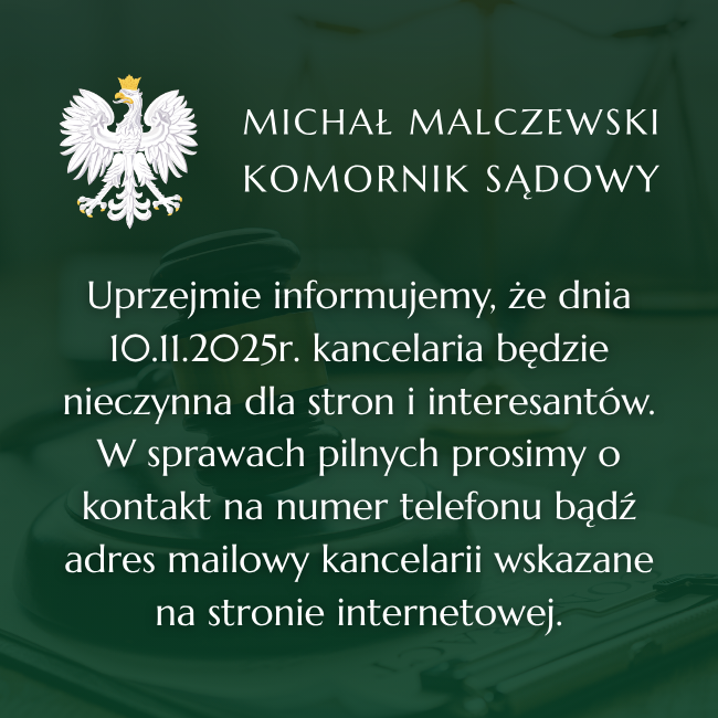 Strona ma charakter jedynie informacyjny, nie stanowi reklamy działalności komornika, a informacje na niej zawarte nie stanowią oferty w rozumieniu Kodeksu Cywilnego.
